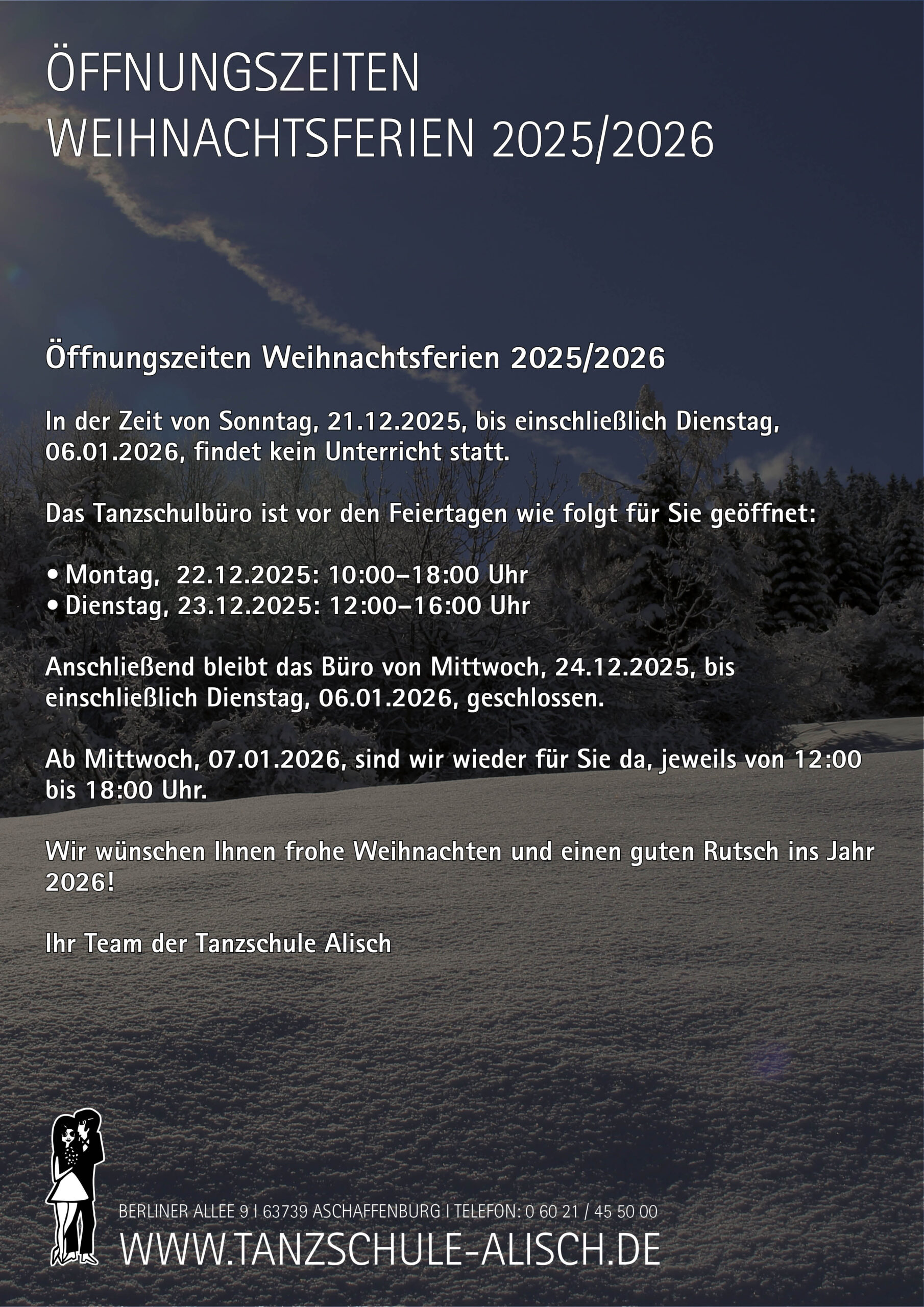 WIR HABEN WEIHNACHTSFERIEN!! alischtanzschule2025-12-01T10:29:41+01:001. Dezember 2025| Ähnliche Beiträge AUFGEPASST!!! NEU – UNSER GRUNDKURS FÜR JUNGE PAARE, SCHÜLER, STUDENTEN UND BERUFSTÄTIGE JUGEND … AUFGEPASST!!! NEU – UNSER GRUNDKURS FÜR JUNGE PAARE, SCHÜLER, STUDENTEN UND BERUFSTÄTIGE JUGEND … DIE FASCHINGSZEIT NAHT … UNSER DISCOFOX EINSTEIGER WORKSHOP 2026 DIE FASCHINGSZEIT NAHT … UNSER DISCOFOX EINSTEIGER WORKSHOP 2026 TANZE MIT UNS WEITER IN DEINEM TANZSCHULJAHR … TANZE MIT UNS WEITER IN DEINEM TANZSCHULJAHR … UNSERE SCHNUPPERWOCHEN FÜR GRUNDKURSSCHÜLER UNSERE SCHNUPPERWOCHEN FÜR GRUNDKURSSCHÜLER NEUE GRUNDKURSE FÜR UNSERE MARIA WARD SCHÜLER … NEUE GRUNDKURSE FÜR UNSERE MARIA WARD SCHÜLER …